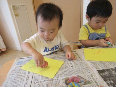 【すみれ保育園】食育「レンコンに触ろう!&野菜スタンプ」~もも組~